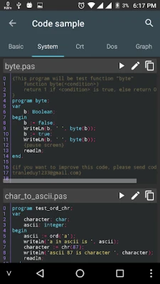Denne app er en Pascal-fortolker til Android. Lær og øv Pascal direkte på mobilen, når som helst og hvor som helst, uden brug af en computer. Perfekt for alle, der ønsker at mestre Pascal-programmering på farten.