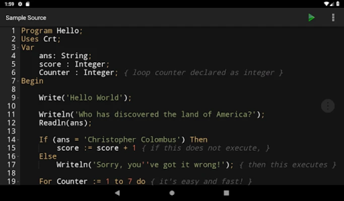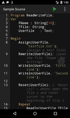 Dyk ned i en avanceret kodeditor, der gør kodning til en leg. Med intelligent syntaksfremhævelse, automatisk parring af parenteser og tydelige linjenumre er fejlfinding og læsbarhed optimeret, så du kan fokusere på logikken i din kode. Når din kode er klar, kan du nemt kompilere og køre dine Kotlin-programmer direkte i appen. Få øjeblikkelig feedback med detaljerede output eller præcise fejlbeskeder, der guider dig til den perfekte løsning. Desuden giver dette miljø dig fuld kontrol over dine filer – åbn, gem, importer og del dine Kotlin-projekter ubesværet med blot et par tryk.