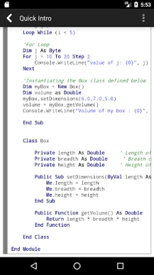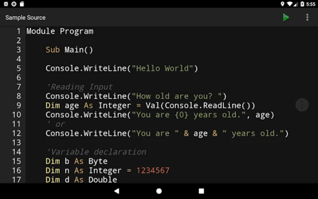 Slip kreativiteten løs og kod VB.NET uanset hvor du befinder dig. Denne intuitive platform er skabt til VB.NET-udviklere, studerende og entusiaster, der ønsker at transformere ideer til funktionel kode på farten. Dyk ned i en avanceret kildekodeeditor, der er designet til at optimere din arbejdsgang med intelligent syntaksfremhævelse, automatisk fuldførelse af parenteser og tydelige linjenumre. Skrivning og fejlfinding af din kode bliver en flydende og ubesværet oplevelse, skræddersyet til effektivitet.